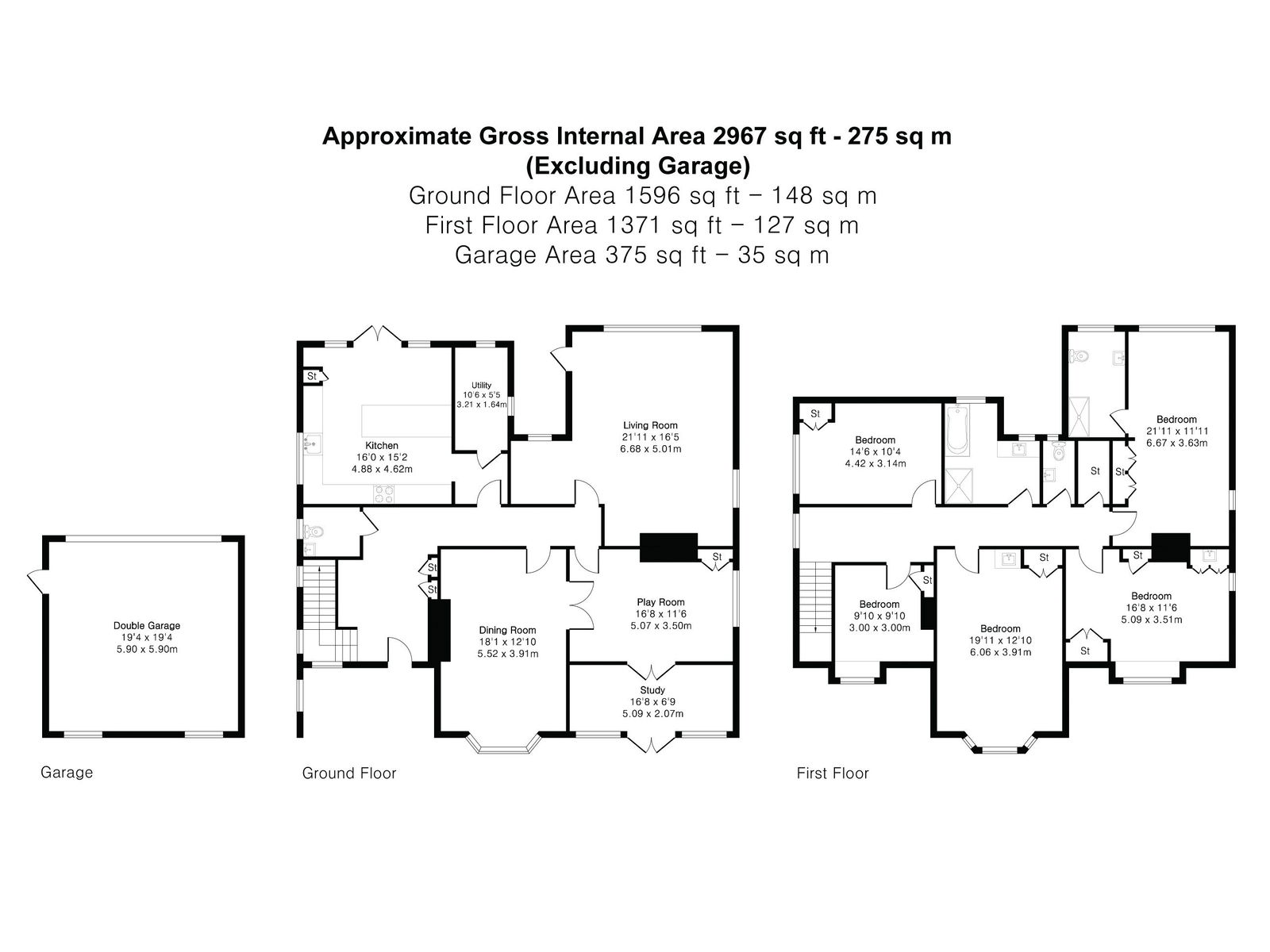 Upstairs, the first floor offers five bedrooms, all comfortably sized and calmly arranged. The principal bedroom is a particularly generous space, complemented by further bedrooms that suit family living, guests or home working with ease. Bath and shower rooms serve the floor well, maintaining a practical and balanced layout.