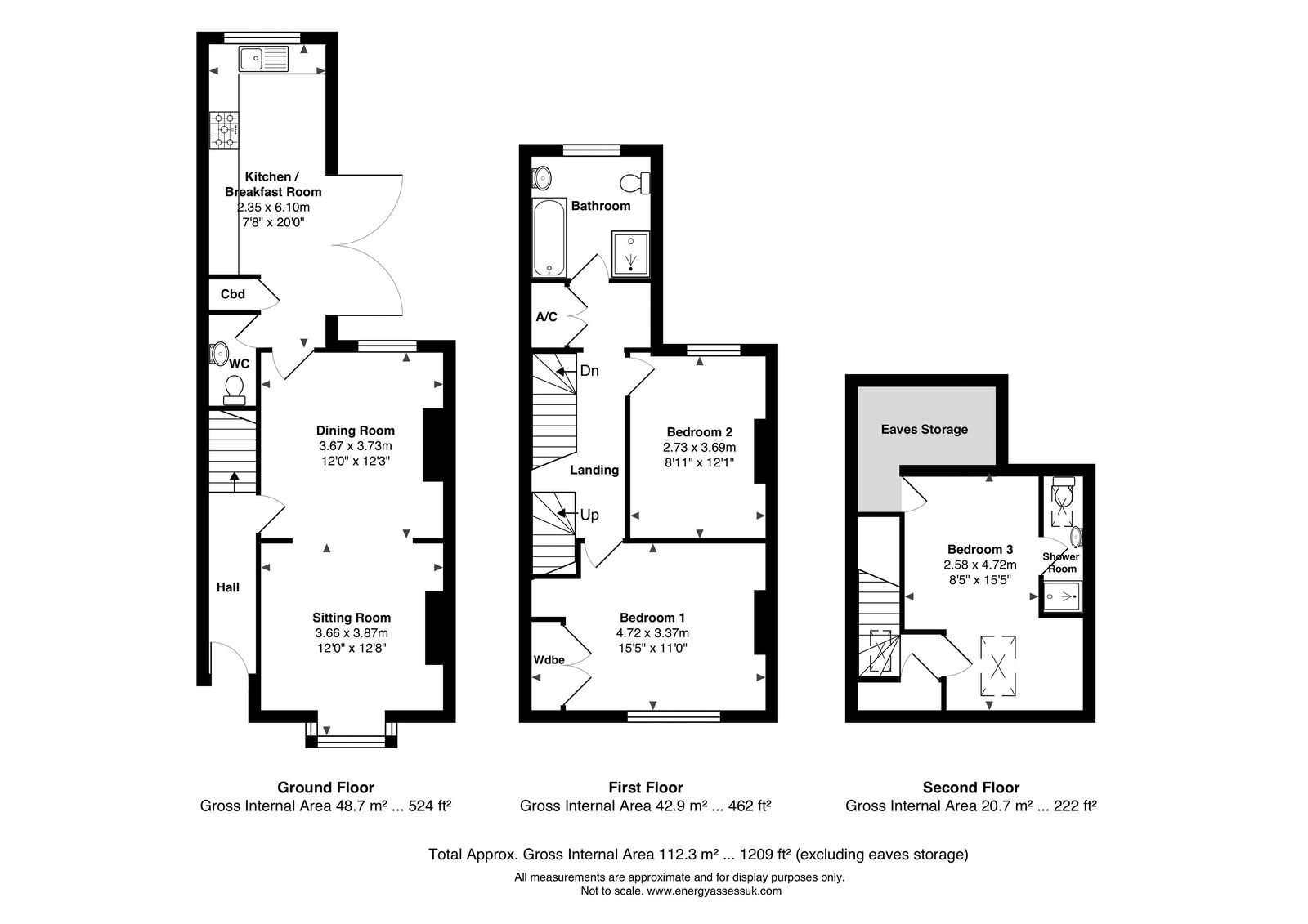 Beautifully presented throughout and extremely well maintained and improved by the present owner the accommodation comprises of a large living room with a wood burning stove comprising two distinct areas including the sitting area to the front with a bay window. The dining area overlooks the garden and opens into the superb kitchen which has been fitted to a high standard and incorporates a wide range of both wall and base units. A dual aspect room, the kitchen has double doors opening onto the decked area and garden. On the first floor are two double bedrooms and a well appointed bathroom with both bath and separate shower. On the 2nd floor is a further double bedroom – with lovely views – and an en suite shower room. A great bonus is the easy access to generous storage space within the eaves area.