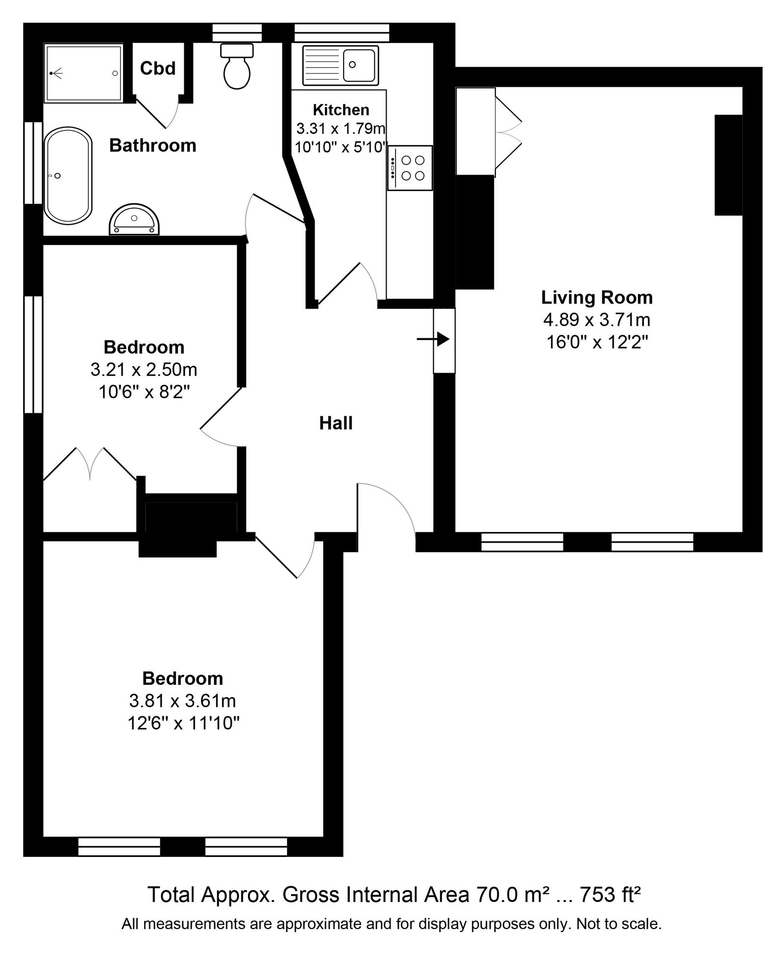The main bedroom is tastefully decorated and benefits from built-in storage, as does the well-proportioned second bedroom. The elegant bathroom is a standout feature, complete with wall panelling, a roll-top bath, and a separate shower.