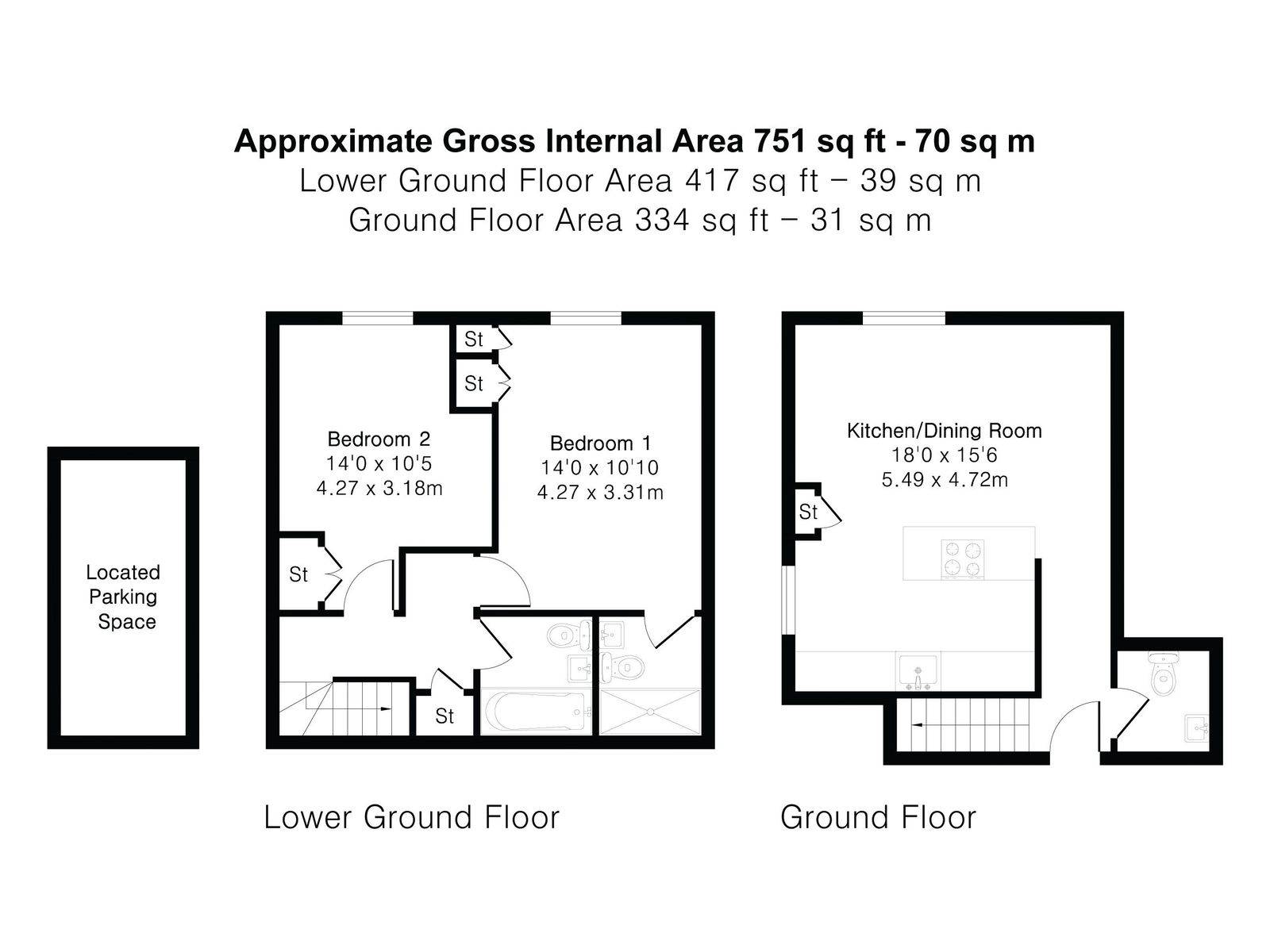 The lower ground floor provides a clear sense of separation, with two comfortable bedrooms positioned away from the main living area. The principal bedroom benefits from an en-suite shower room, while the second bedroom is served by a well-finished contemporary bathroom. Both rooms feel private and well-sized, with space for storage and flexible use.